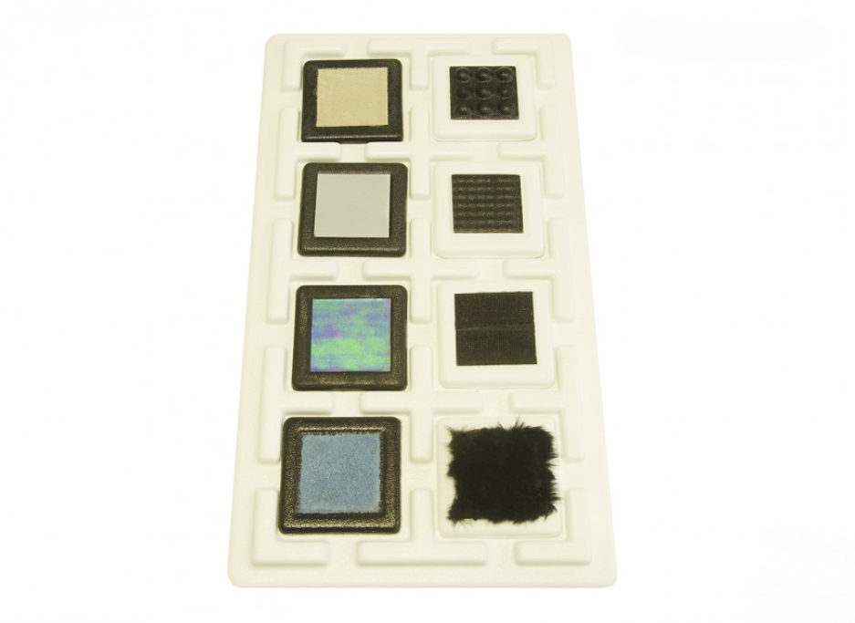 Набор для выявления и развития сенсомоторных навыков у ребенка. Данный набор состоит из планшета-основы, 8 сменными тактильными пластинами с различными материалами (мягкий, гладкий, шершавый, шороховатый, длинный мягкий ворс, жесткий мелкий ворс, мелкофактурная твердая поверхность, крупнофактурная твердая поверхность). Работа с набором помогает учителю и ребенку в процессе занятий выработать методы по исправлению сенсорной дисфункции с пассивной или осязательной системой. Развивает основные навыки: сенсорное восприятие, тактильные навыки.