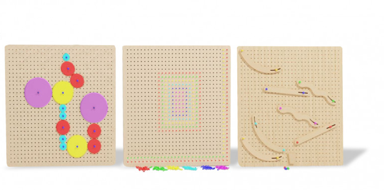 - Три разные доски имеют свое предназначение. В 1-ой можно двигать спирали, вкручивать и выкручивать винты, и переставлять фигуры. На 2-й доске можно с помощью цветных булавок создавать свои рисунки: геометрические фигуры, цифры или просто линии. Вместе изучать цвета, проговаривая их вслух. Во время занятия активно развивается интеллект каждого ребенка. Обучаясь счету, он учится концентрироваться на задаче, воспитывает в себе усидчивость, расширяет словарный запас и анализирует входящую информацию, делая на основе анализа соответствующие выводы. На 3-й доске подвижные фигуры перемещают шарик.