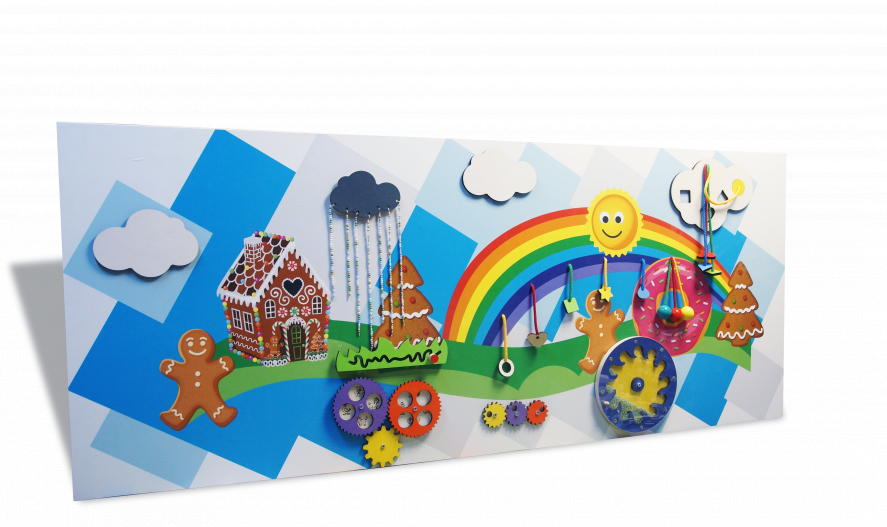 Настенная панель на тему веселых приключений - сказочная настенная игровая панель для весёлого времяпрепровождения малышей. Основание представленной модели имеет сложную многоугольную форму, выполнено в бело-голубой гамме, а игровые элементы выделяются на нём яркими акцентами.