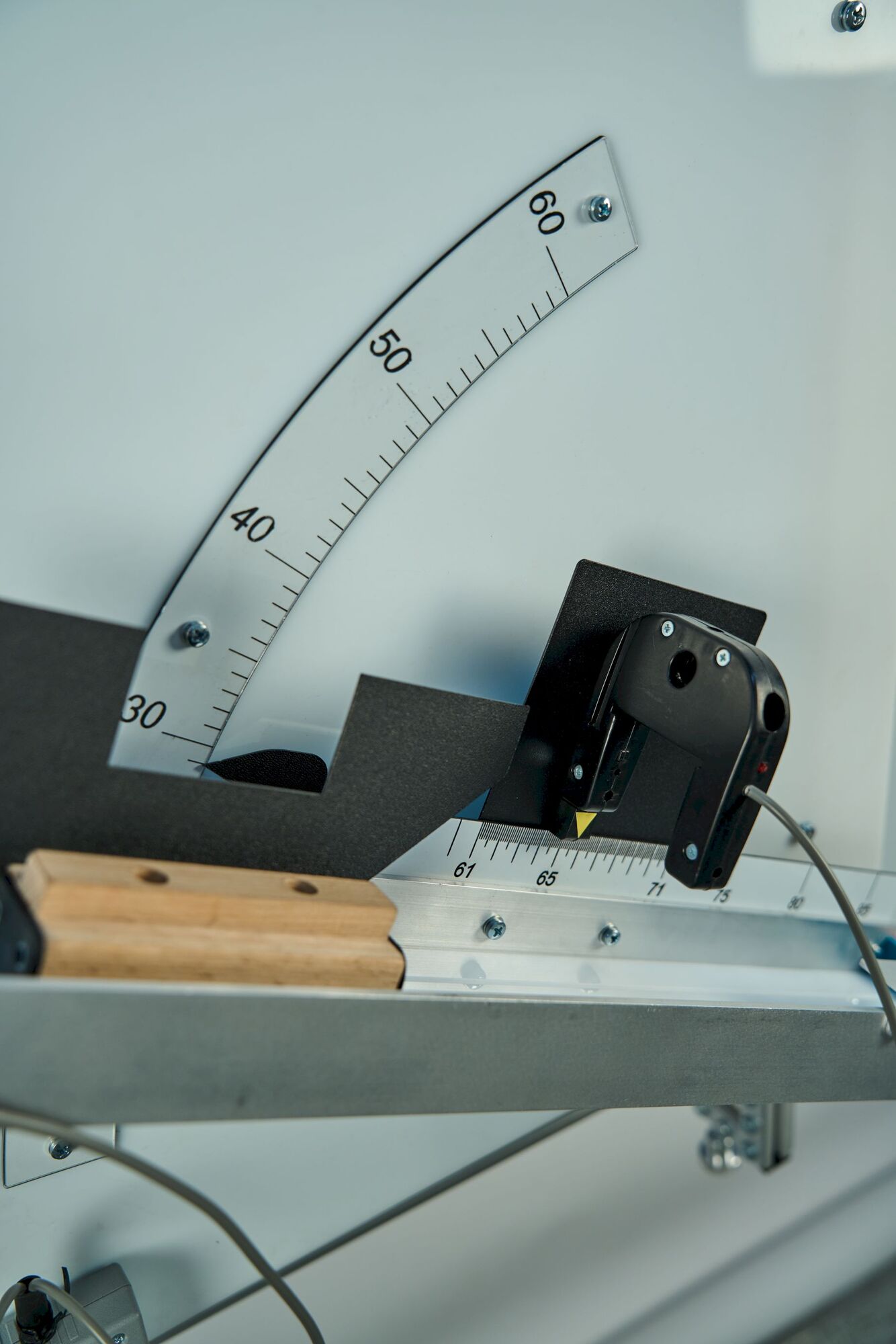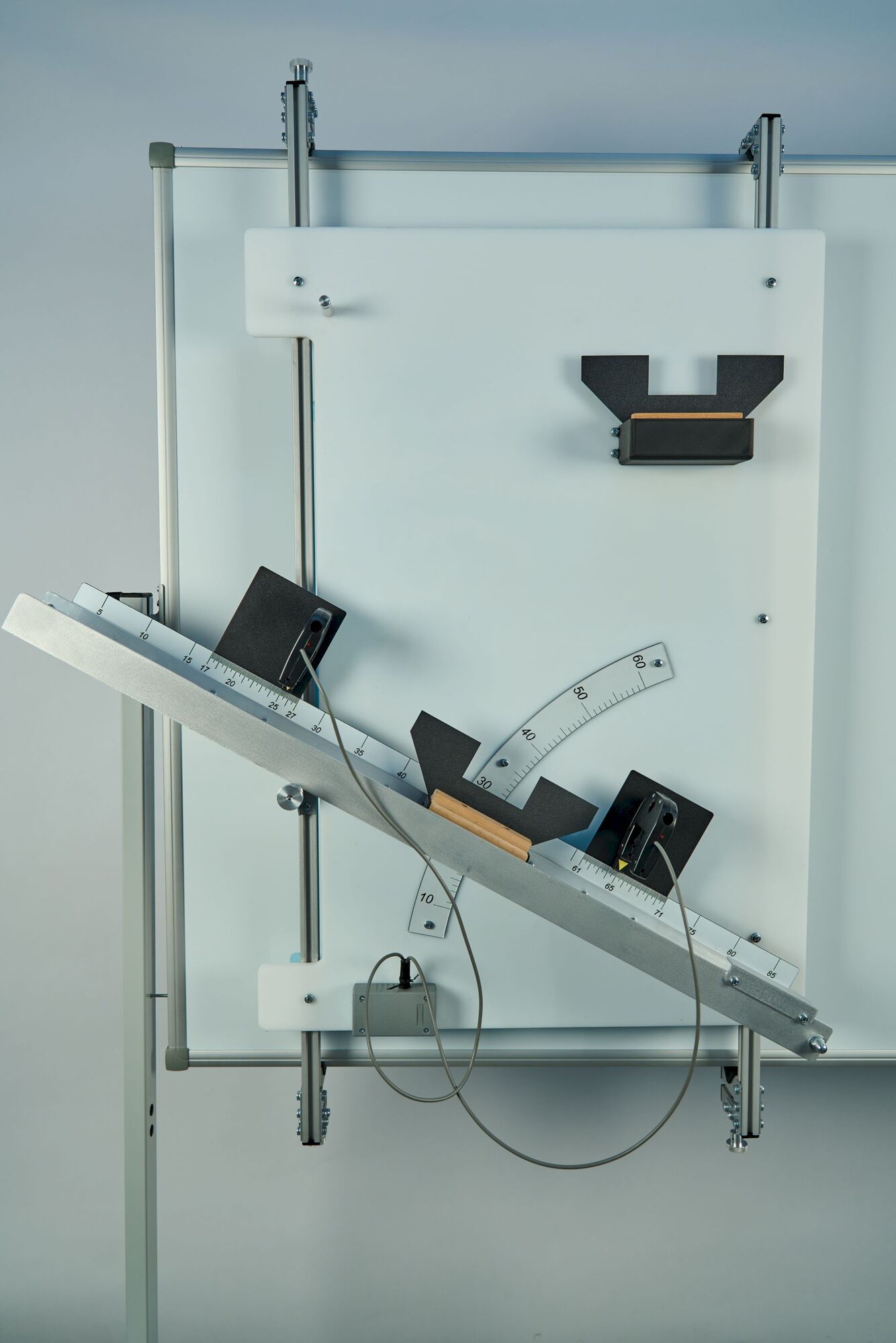 Основным элементом лабораторной установки является скамья, магнитное крепление которой позволяет устанавливать её под любым углом к горизонту. Скамья имеет шкалу для определения положения датчиков и транспортир с отвесом для измерения угла наклона. Движение брусков, которые отличаются друг от друга только материалом скользящей поверхности, контролируется оптоэлектрическими датчиками.