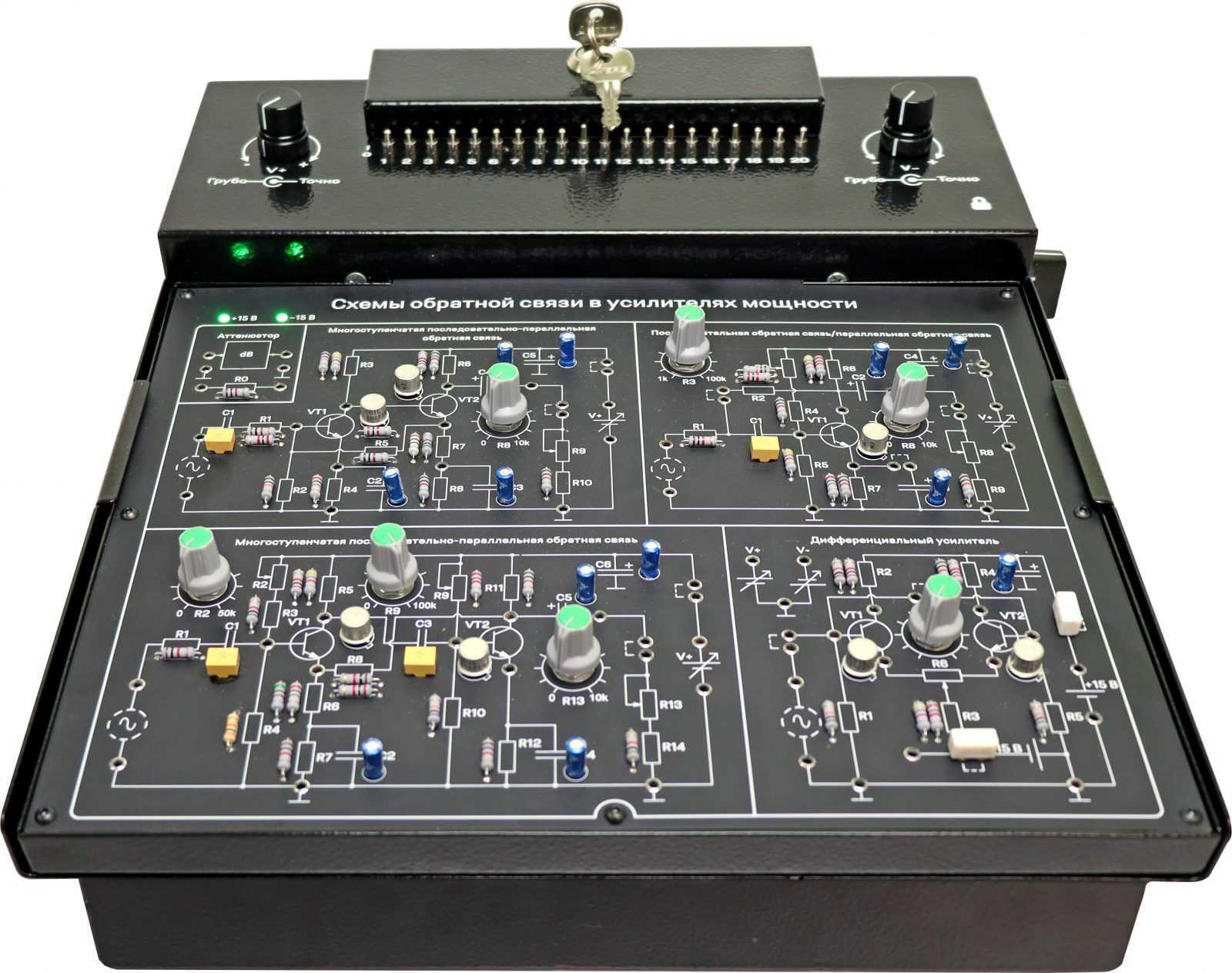 - двадцатью тумблерами для управления режимами работы различных лабораторных модулей (применение зависит от сменного лабораторного модуля);