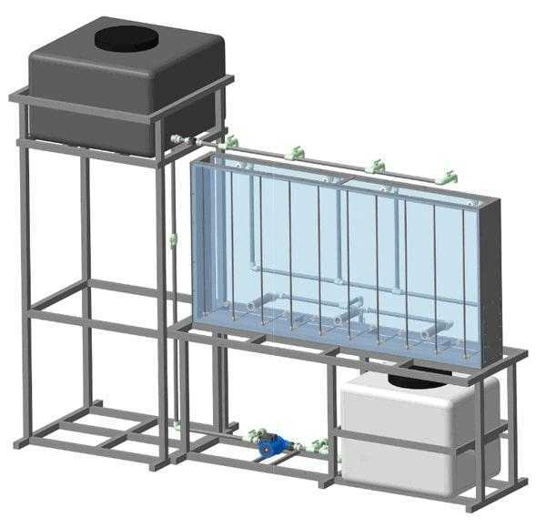 Внешние габариты лотка см: Д200 x В100 x Ш25 Дно лотка расположено от пола на расстоянии, см 90 В передней стенке лотка установлены 10 пьезометры на расстоянии друг от друга, см 10 Установлен кран в местах выхода дренажных труб из лотка, шт 3 Стенки лотка выполнены из прозрачного оргстекла, толщиной, мм. 10 Все стыки гидроизолированы клеем Диаметр дренажных труб из ПВХ, диаметром, мм 15 Дренажное полотно DELTA-GEO-DRAIN-TP, размеры, мм 250х800 Регулирующий бак для подачи воды в лоток, мм 1000х1000х500
