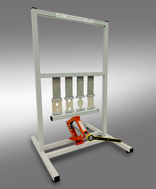 Стенд представляет собой сварную раму, на которой установлен винтовой механизм двойного действия. Нижняя подвижная траверса состоит профиля квадратного сечения. На подвижной и неподвижной траверсах закреплена часть оснастки для установки образцов.