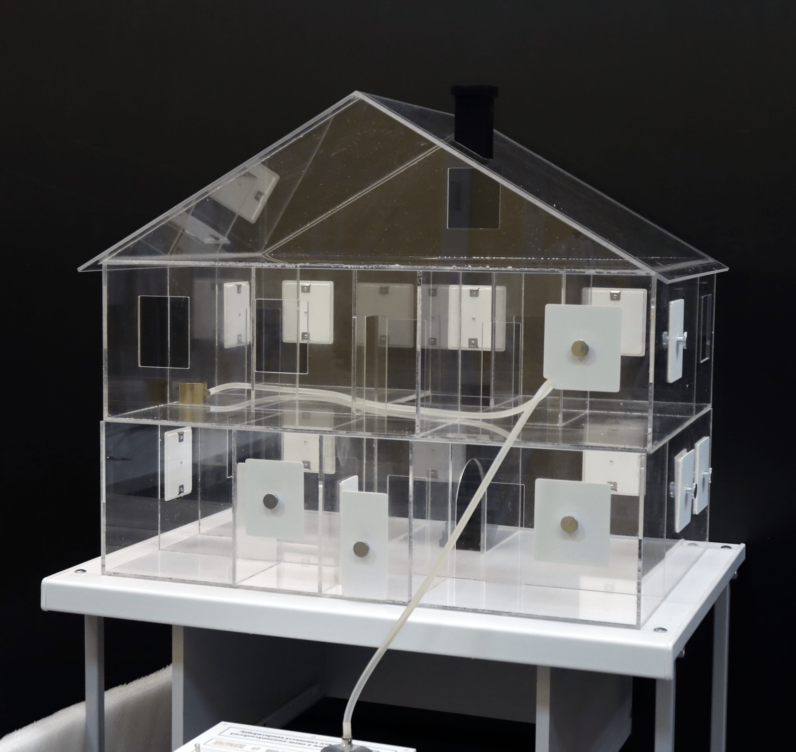 Разборная модель жилого дома с открывающимися дверями и окнами. Стены прозрачные. Модель разборная и легко разбирающаяся на три части: крыша, второй этаж и первый этаж, для очистки прозрачных стен модели дома. Двери и окна могут быть закрыты или открыты что позволяет моделировать различные режимы распространения дыма.