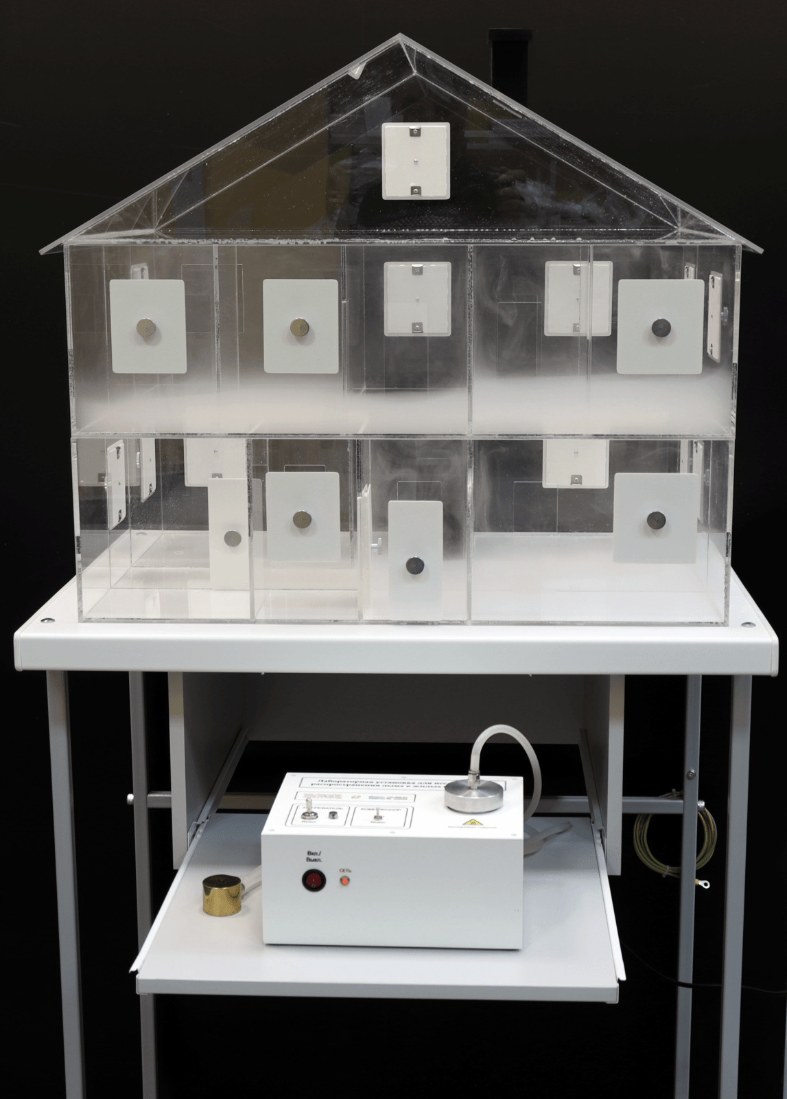 Лабораторная установка (далее стенд) предназначена для изучения принципов распространения дыма в жилых помещениях и представляет собой макет дома в масштабе 1:10. Стенд имеет габариты (ДхШхВ) – 800х600х1600.