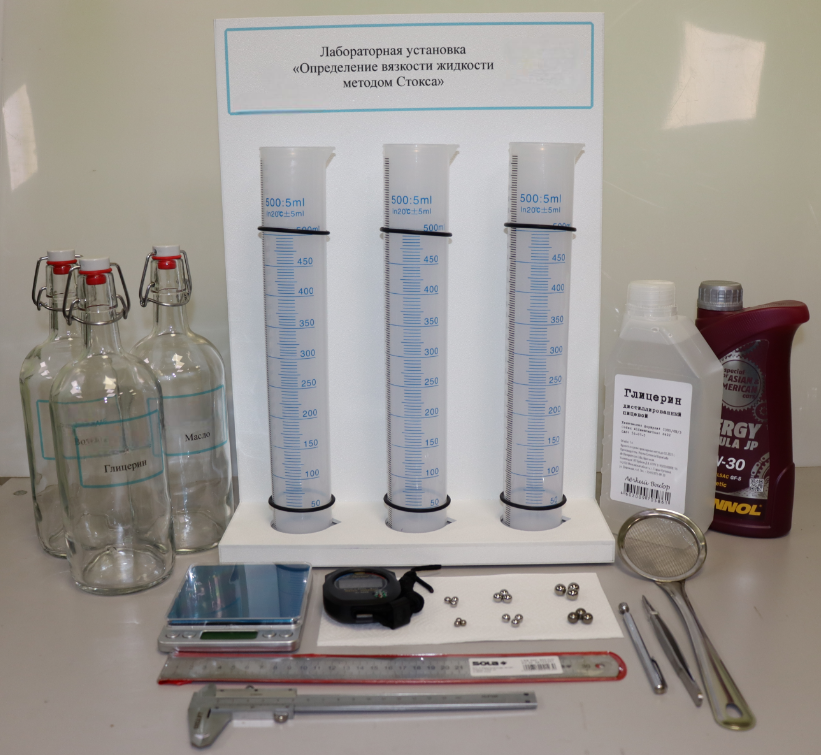 В состав комплекта входит: цилиндрический сосуд, набор исследуемых жидкостей, набор калиброванных шариков, штангенциркуль, секундомер, линейка.