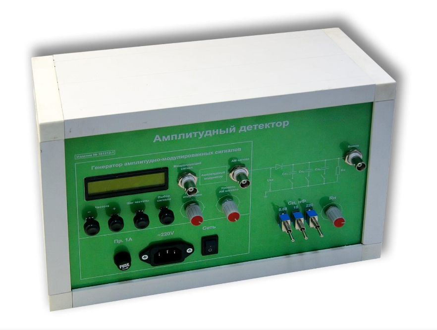 Лабораторная установка формирует одно рабочее место и обеспечивает проведение эксперимента по теме «Амплитудный детектор» учебного лабораторного практикума радиотехнических специальностей. Лабораторный модуль предназначен для изучения принципов построения схемы амплитудного детектора радиоприемных устройств. Лабораторный комплекс используется для постановки лабораторных работ и проведения практических и демонстрационных занятий по курсу «Радиоприемные и передающие устройства».