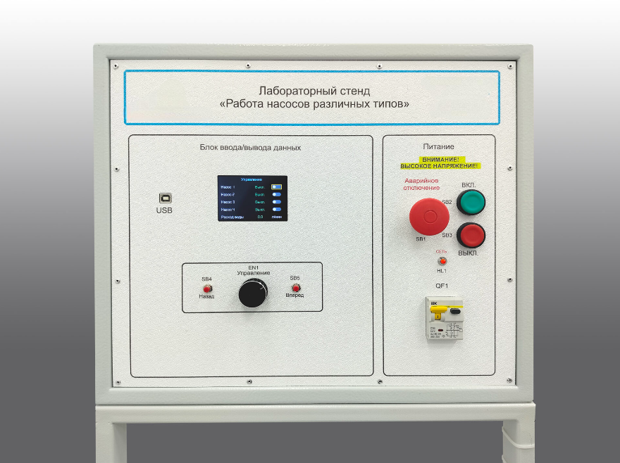 Для проведения лабораторных работ стенд укомплектован измерительной и управляющей системами. Все датчики, установленные на объектах исследования, подключены к измерительной системе. Управляющая система, обеспечивает включение и выключение насосов.