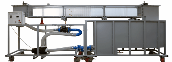 Гидравлический лоток выполнен из прозрачного материала, позволяющего наблюдать за гидравлическими процессами. Механизм стенда позволяет изменять угол наклона гидравлического лотка. В стенде используются технологические баки, что позволяет работать со стендом, не подключая его к системе водоснабжения и водоотведения лаборатории, для циркуляции воды в системе используется насос.