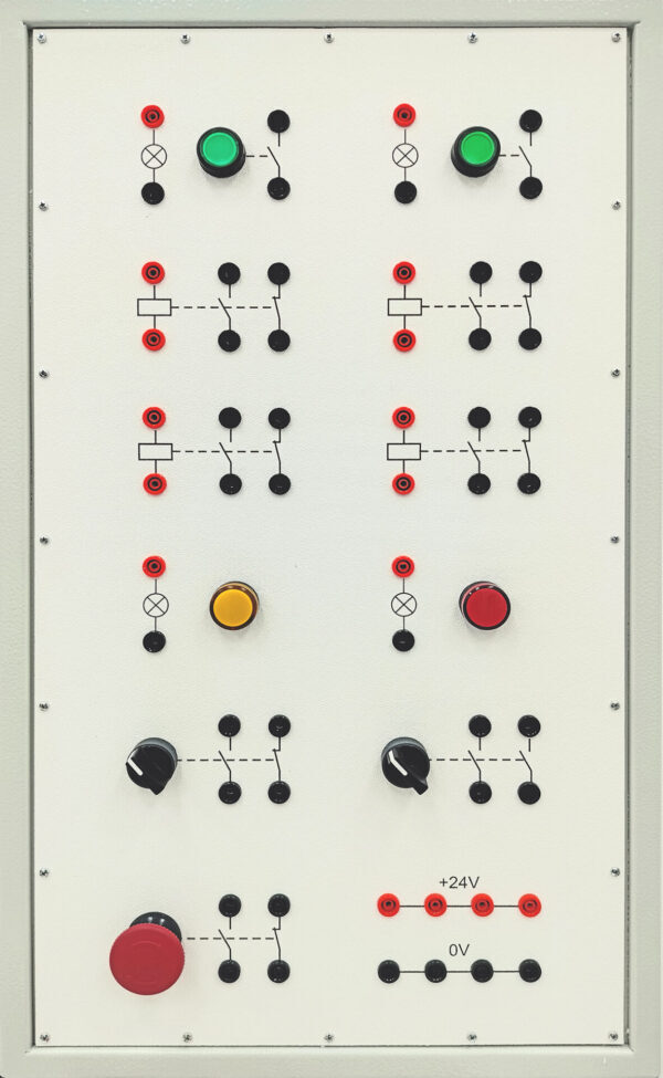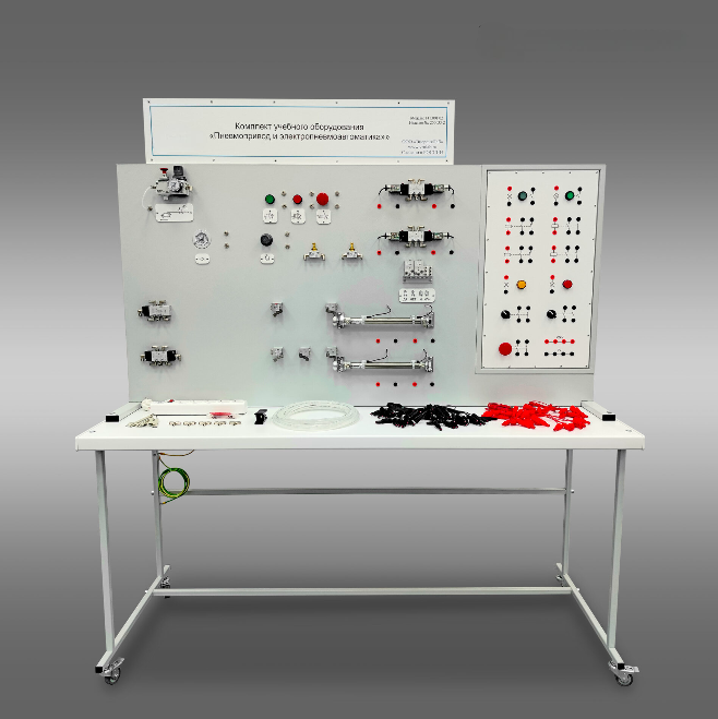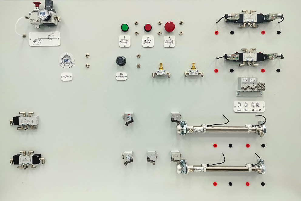 Учебный комплект электропневматических элементов для изучения структур и законов управления электропневматическими приводами.