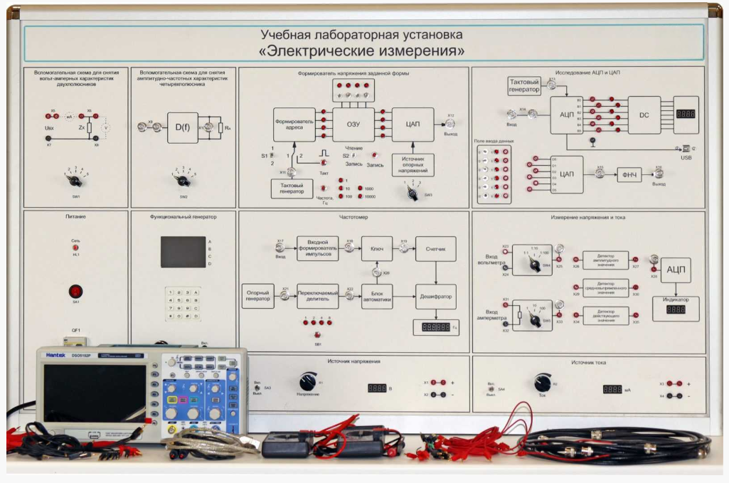 Учебная лабораторная установка «Электрические измерения» представляет собой рабочее место для бригады студентов из двух человек и предназначена для проведения лабораторных занятий по дисциплинам «Электрорадиоизмерения», «Электротехнические измерения», «Измерительная техника», «Электрические измерения», «Метрология и радиоизмерения» и другим учебным дисциплинам, изучающим принципы электрических измерений.