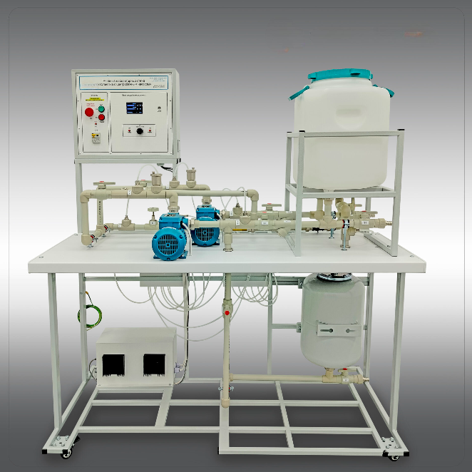 В системе располагается технологический бак, позволяющий производить лабораторные работы не подключая стенд к сети водоснабжения и канализации лаборатории. В системе располагаются два центробежных насоса. Система трубопроводов и задвижек позволяет подключать из как последовательно, так и параллельно.